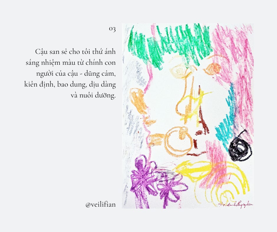 Tôi nghĩ mình mới là kẻ mang ơn khi được cùng cậu đi trên hành trình này, được thấy cậu vỡ ra, mỏng manh, trần trụi và chân thật. Cậu san sẻ cho tôi thứ ánh sáng nhiệm màu từ chính con người của cậu - dũng cảm, kiên định, bao dung, dịu dàng và nuôi dưỡng.