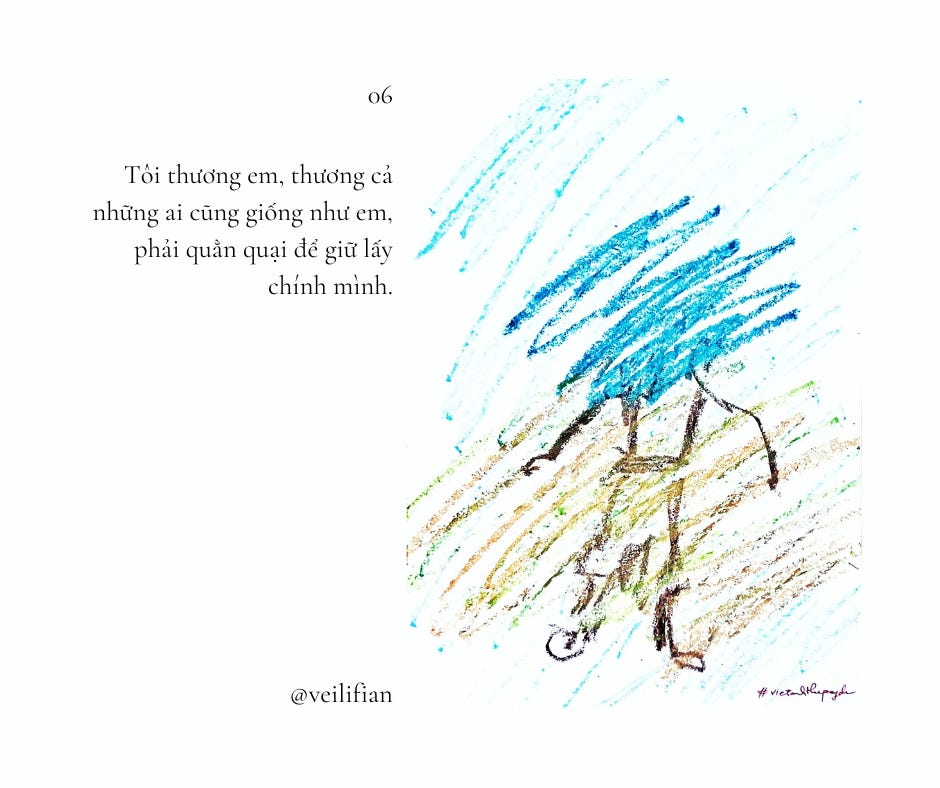 Tôi thấy mình hơi nghẹn lại. Tôi không thể hình dung rõ ràng được những câu chuyện em đã từng trải qua. Và có lẽ tôi cũng sẽ chẳng bao giờ biết được chuyện gì xảy ra với những người bình thường xung quanh mình. Vì trông họ nào có khổ đau, và chắc chẳng ai muốn mình trông khổ đau. Tôi thương em, thương cả những ai cũng giống như em, phải quằn quại để giữ lấy chính mình.