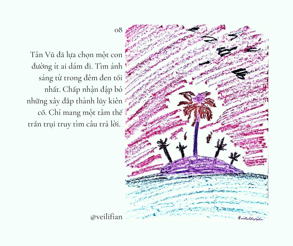 Tân Vũ đã lựa chọn một con đường ít ai dám đi. Tìm ánh sáng từ trong đêm đen tối nhất. Chấp nhận đập bỏ những xây đắp thành lũy kiên cố. Chỉ mang một tâm thế trần trụi truy tìm câu trả lời.