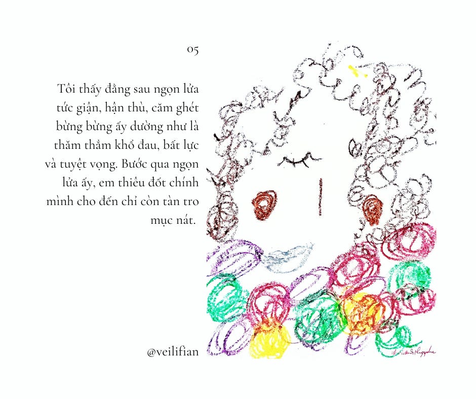 Tôi thấy đằng sau ngọn lửa tức giận, hận thù, căm ghét bừng bừng ấy dường như là thăm thẳm khổ đau, bất lực và tuyệt vọng. Bước qua ngọn lửa ấy, em thiêu đốt chính mình cho đến chỉ còn tàn tro mục nát.