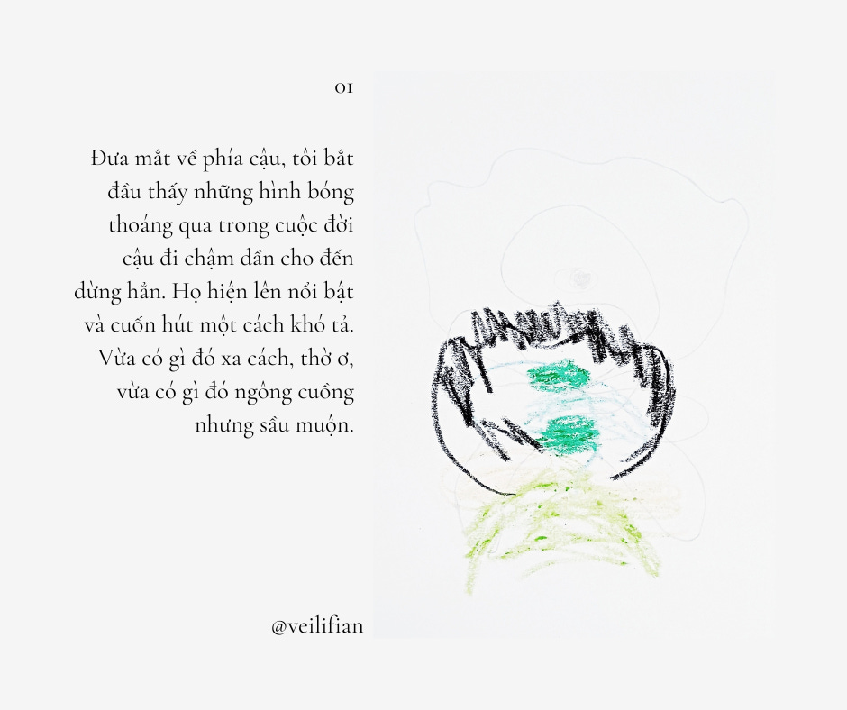 Cậu bắt đầu kể về những hình bóng thoáng qua trong cuộc đời như những niềm vui nhỏ nhoi bất chợt. Tạm bợ. Chóng vánh. Không một lời nói. Không một cái chạm. Cũng chẳng ai nhìn ai. Cậu ở mãi phía sau khi mọi thứ vụt qua mình, khơi dậy một ánh lửa hắt hiu rồi vụt tắt.