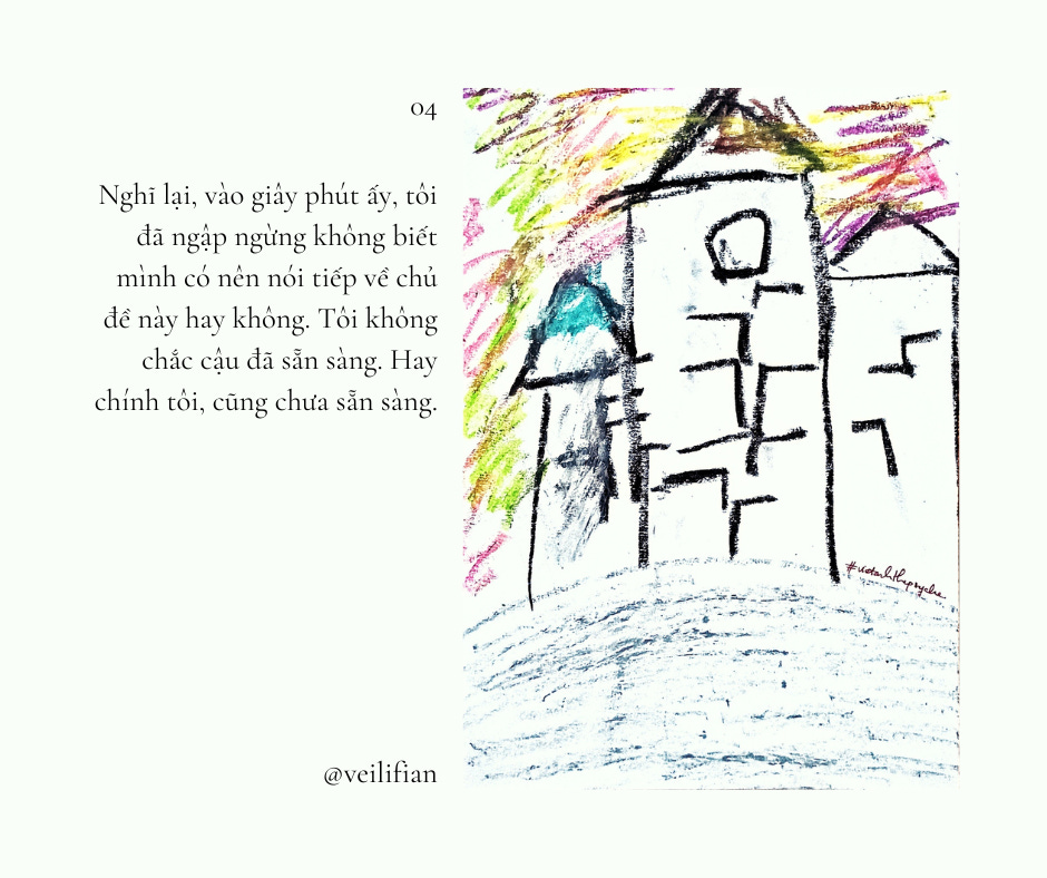 Nghĩ lại, vào giây phút ấy, tôi đã ngập ngừng không biết mình có nên nói tiếp về chủ đề này hay không. Tôi không chắc cậu đã sẵn sàng. Hay chính tôi, cũng chưa sẵn sàng.