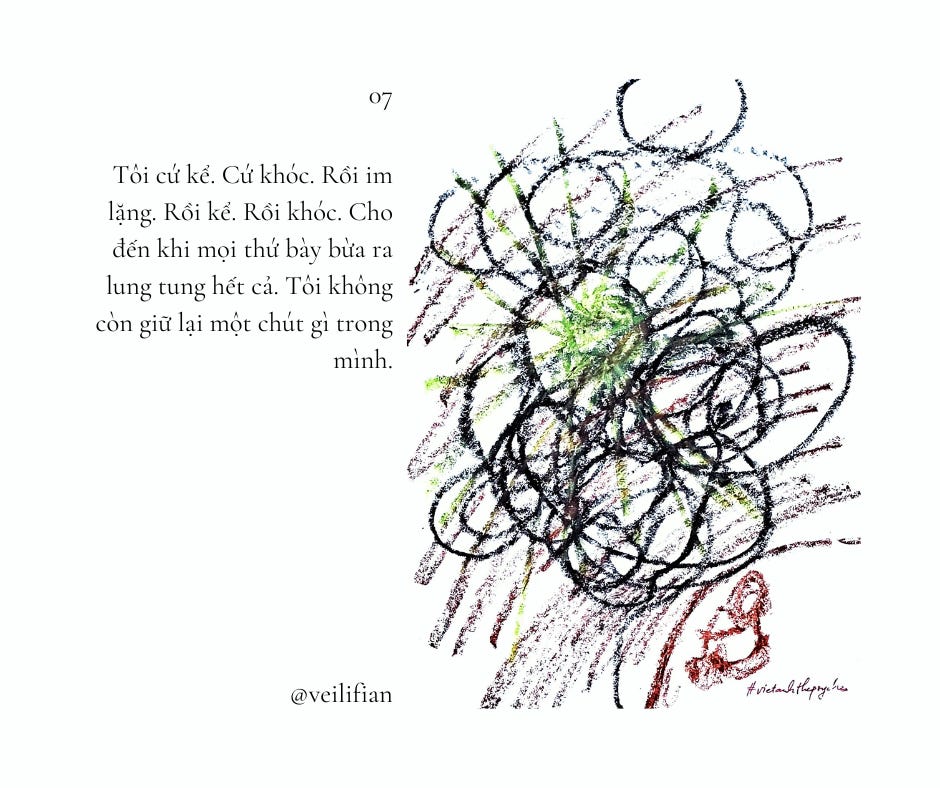 Tôi đã kể rất nhiều và cũng khóc rất nhiều. Cảm giác khóc lóc thật nhẹ nhõm. Có lẽ vì tôi khóc với anh. Tôi cứ kể. Cứ khóc. Rồi im lặng. Rồi kể. Rồi khóc. Cho đến khi mọi thứ bày bừa ra lung tung hết cả. Tôi không còn giữ lại một chút gì trong mình.