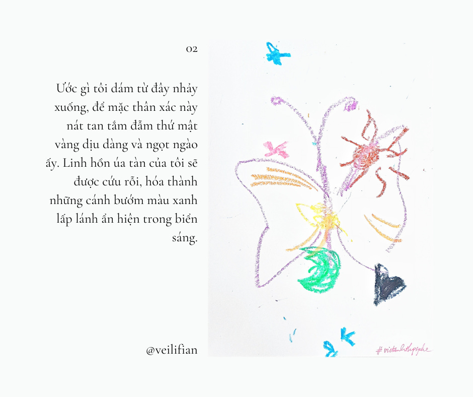 Ước gì tôi dám từ đây nhảy xuống, để mặc thân xác này nát tan tắm đẫm thứ mật vàng dịu dàng và ngọt ngào ấy. Linh hồn úa tàn của tôi sẽ được cứu rỗi, hóa thành những cánh bướm màu xanh lấp lánh ẩn hiện trong biển sáng.